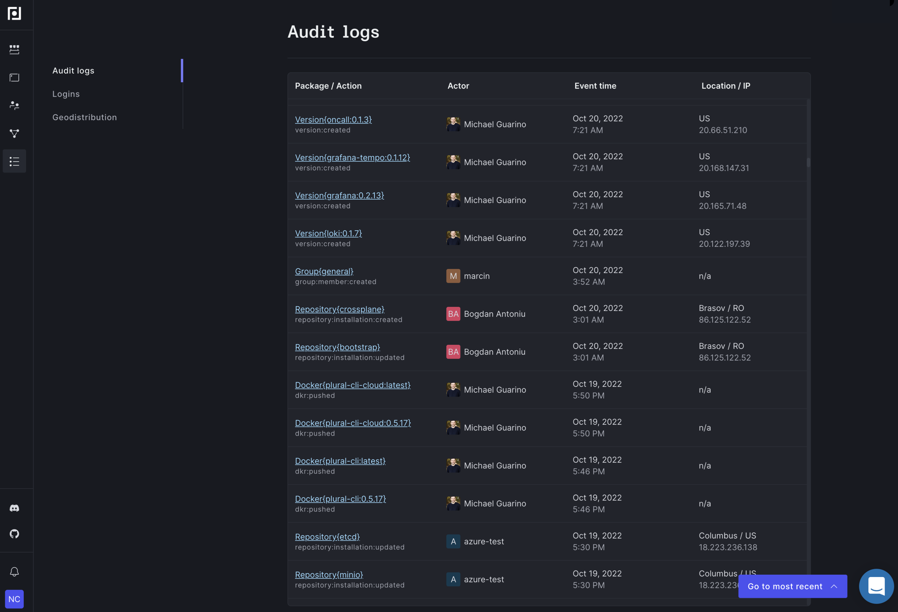 All mutations in both Plural and the Plural Console have full audit logging, which can be attributed back to the actor and IP address responsible. You can view the Plural audit logs here: https://app.plural.sh/audits and should be able to see a table of actions, the resources acted upon and the actor looking somewhat like