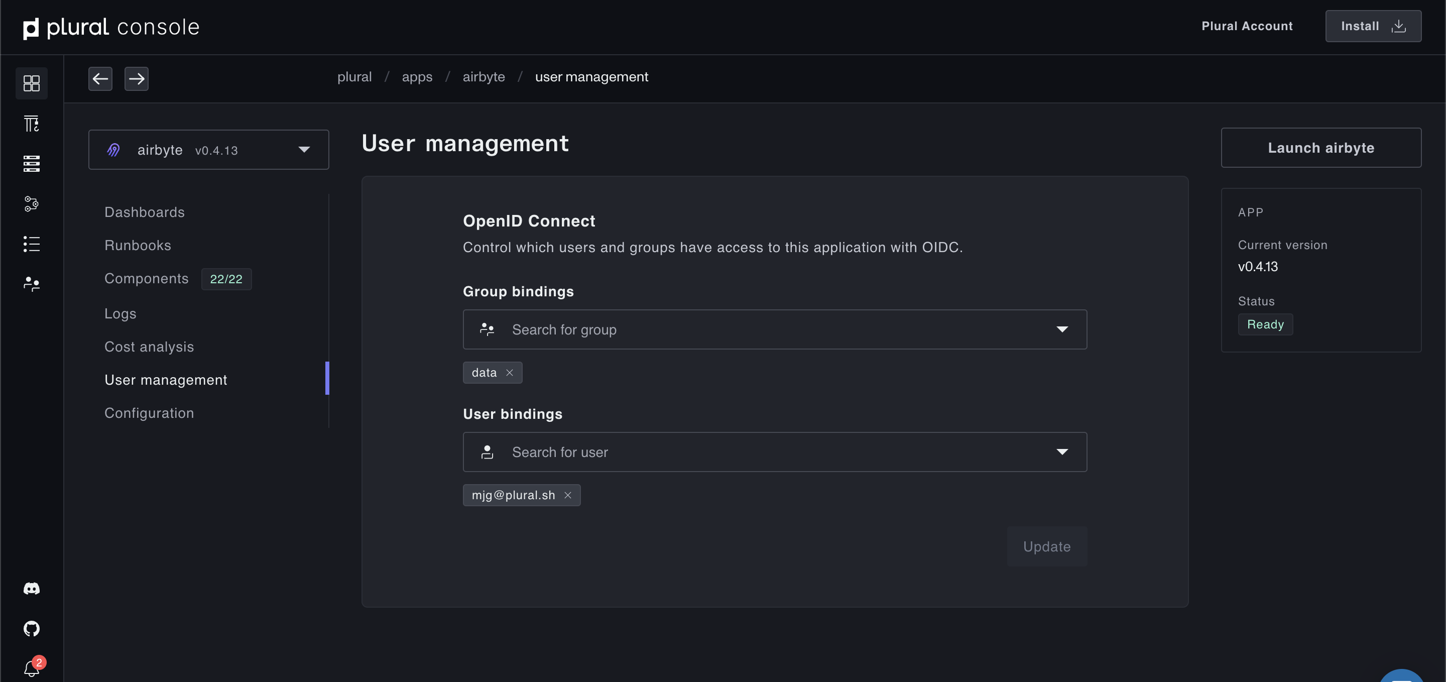 Any Plural Console user with permissions to manage users and groups can add users to any installed application. Navigate to the Plural Console and select your application from the Application Overview tab. Click the "User management" option from the menu on the left. This allows you to search for additional user or group bindings to add for access. Add any new users or groups and click "Update" in the bottom right.