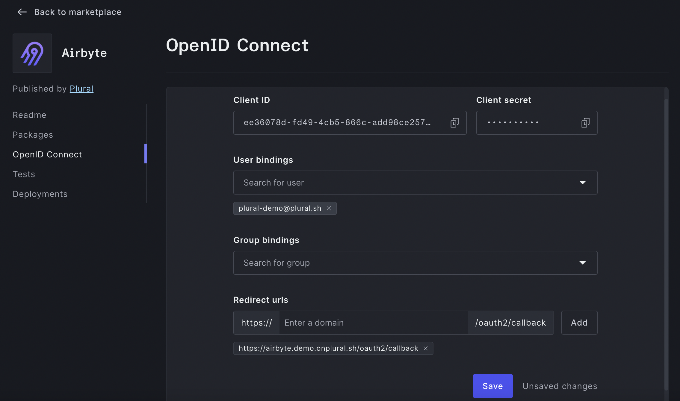 Admin users who have installed an application have the ability to add users to that application. To add users, navigate to the installed application in the Plural Marketplace. Click the application and select "OpenID Connect" in the sidebar on the left. This will open the form to add user or group bindings for this application. Add any new users or groups and click "Save" in the bottom right.